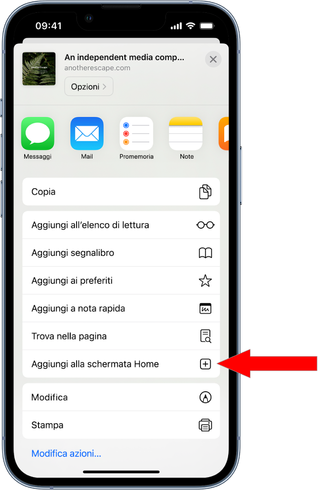 Se “Aggiungi alla schermata Home” non è presente, puoi aggiungerlo. Scorri in fondo all'elenco, tocca “Modifica azioni”, quindi tocca “Aggiungi alla schermata Home”.